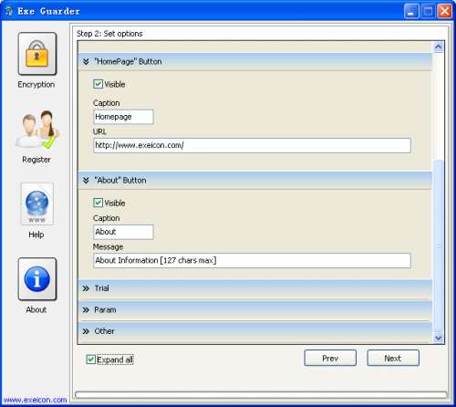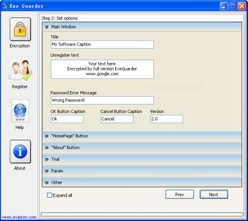 Option window allows you customize caption,text,version,error message and so on