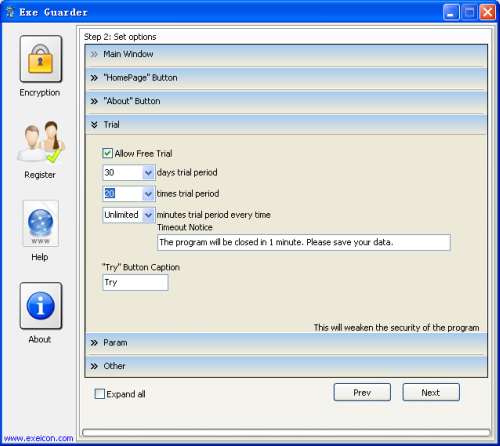 Add trial period to your application by checking "Allow free trial". Trial period can be a few days, a few use-times or several minutes each time. Trial period can be removed by unchecking it.